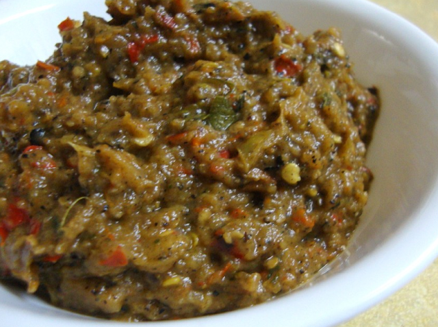 Roast the eggplant in hot oven till the skin gets slightly burnt and shriveled.Put the hot eggplant in a bowl of water and remove the skin.